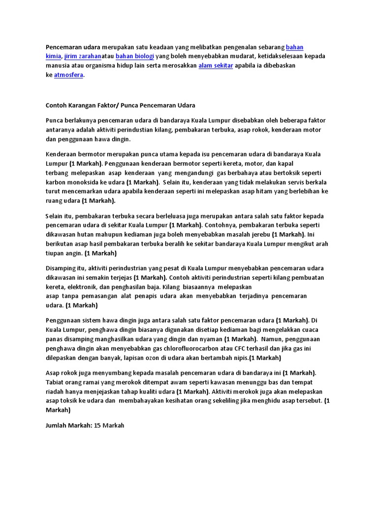 Kenderaan bermotor merupakan punca utama kepada isu pencemaran udara di bandaraya kuala lumpur (1 markah). Pihak awam yang dirujuk dalam kajian ini ialah masyarakat awam. Ringkasnya, sejarah awal pencemaran udara di lembah klang menunjukkan ia berpunca daripada asap kenderaan yang mengandungi pm 10, so x, co dan no x. Terakhir diperbarui 11:00, jul 13 (waktu setempat) 381.8k orang mengikuti kota ini. Beberapa individu dirakam percakapan sejak isnin bagi membantu siasatan mengenai pencemaran di bawah akta kualiti alam sekeliling 1974 (akta 127).